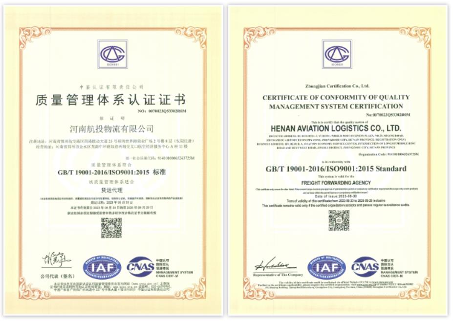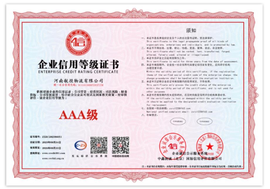 近日,航投物流通過GB/T 19001-2016/ISO 9001:2015質(zhì)量管理體系認證審核,榮獲ISO質(zhì)量管理體系認證證書,同時獲得了企業(yè)信用的最高評定——AAA級企業(yè)信用等級證書,被授予“十證一牌”。喜獲雙重肯定,意味著航投物流在行業(yè)綜合競爭中邁上新臺階,是對其高效業(yè)務(wù)流程、標(biāo)準(zhǔn)化經(jīng)營、規(guī)范化管理模式的肯定。