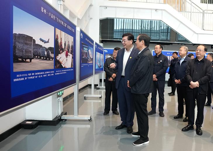 在位于鄭州航空港區(qū)的航投培訓(xùn)中心,劉奇葆首先參觀了“鄭盧‘空中絲綢之路’的探索與實踐”圖片展。張明超詳細(xì)介紹了35張圖片背后的故事和內(nèi)涵,匯報了“一帶一路”框架下鄭盧“空中絲路”的建設(shè)歷程和發(fā)展現(xiàn)狀。