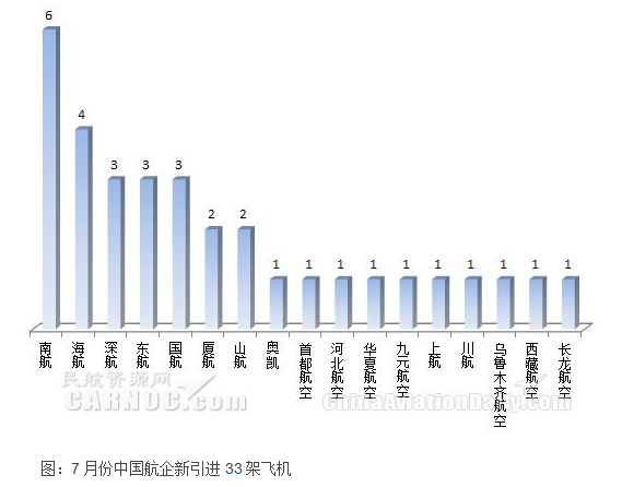 根據(jù)民航數(shù)據(jù)分析系統(tǒng)CADAS,2016年7月份中國大陸航空公司新引進(jìn)飛機(jī)33架。其中南航引進(jìn)飛機(jī)數(shù)量最多,為6架;機(jī)型方面,737-800飛機(jī)數(shù)量最多,為16架。