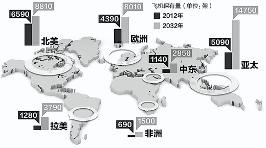根據(jù)波音公司的預(yù)測(cè),未來(lái)20年全球民機(jī)市場(chǎng)規(guī)模將翻一番,新興市場(chǎng)成為增長(zhǎng)主動(dòng)力。到2032年,全球?qū)⑿略龀^(guò)3.5萬(wàn)架飛機(jī),總額高達(dá)4.8萬(wàn)億美元。亞太市場(chǎng)增幅最大,將新增1.282萬(wàn)架飛機(jī),總額1.89萬(wàn)億美元。其中,中國(guó)市場(chǎng)發(fā)展最為迅速??湛凸究偛眉媸紫瘓?zhí)行官密法布里斯·布利葉認(rèn)為,中國(guó)航空業(yè)的迅速發(fā)展是中國(guó)經(jīng)濟(jì)社會(huì)發(fā)展的必然產(chǎn)物,中國(guó)航空業(yè)發(fā)展的年均增速約為10%,同期全球航空業(yè)的增速則為5%。在未來(lái)20年,中國(guó)將成為世界最大的航空市場(chǎng)。