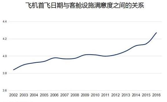 上圖是飛機(jī)首飛日期與客艙設(shè)施滿意度之間的關(guān)系,可以看出首飛日期越近滿意度越高,首飛日期越早滿意度越低,而且是持續(xù)地降低?!耙簿褪钦f(shuō)我們?nèi)说男枨笤谧兓?,我們得跟上人的需求變化。行業(yè)的標(biāo)準(zhǔn)是持續(xù)的在升級(jí)的,我們需要往前追趕?!?
